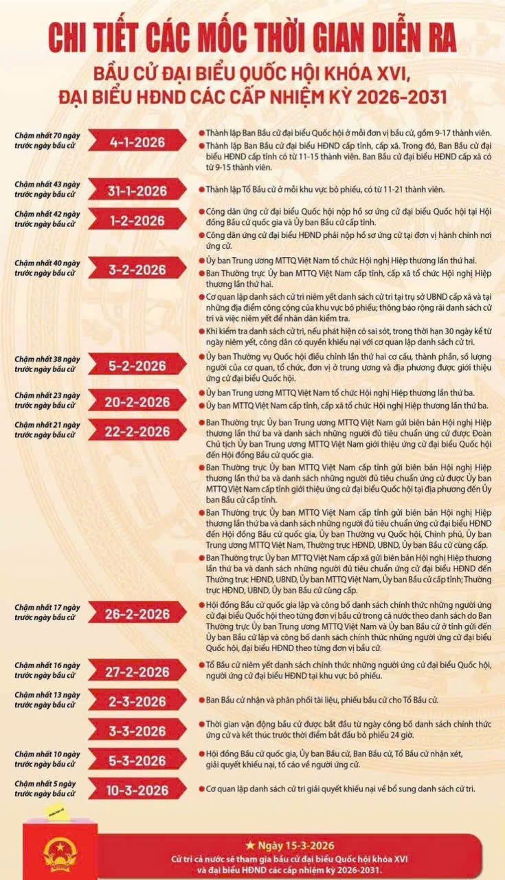 CHI TIẾT CÁC MỐC THỜI GIAN DIỄN RA BẦU CỬ ĐẠI BIỂU QUỐC HỘI KHÓA XVI, ĐẠI BIỂU HĐND CÁC CẤP NHIỆM KỲ 2026-2031
