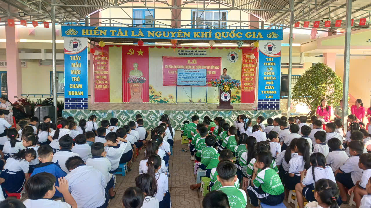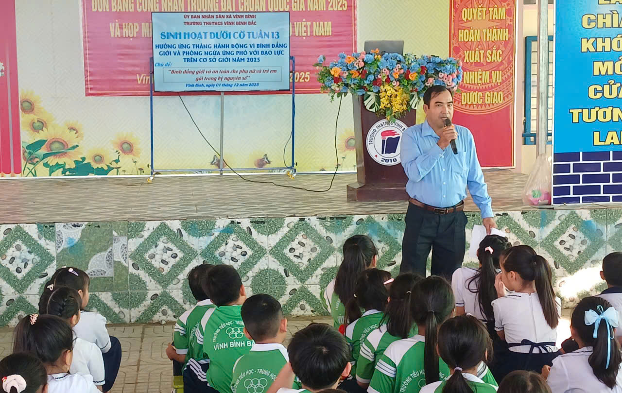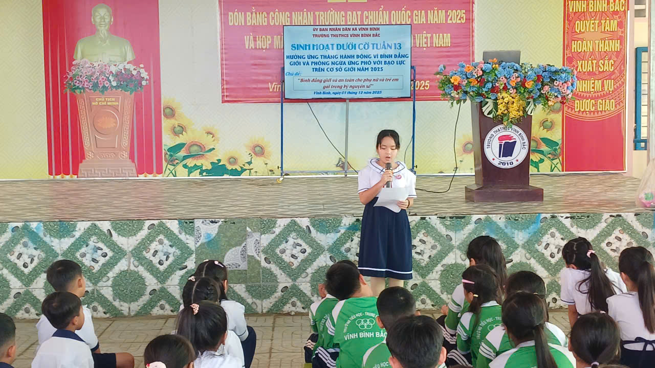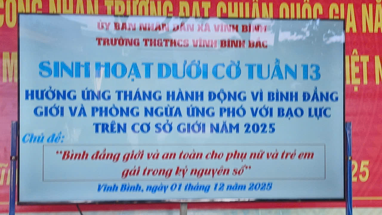 Sáng ngày 01/12/2025, tại sân trường TH&THCS Vĩnh Bình Bắc, tổ chức buổi sinh hoạt dưới cờ với chủ đề “Hưởng ứng Tháng hành động vì bình đẳng giới và phòng ngừa, ứng phó với bạo lực trên cơ sở giới năm 2025”. Đây là hoạt động thiết thực nhằm tuyên truyền, nâng cao nhận thức cho học sinh về quyền bình đẳng giới, xây dựng môi trường học đường an toàn, thân thiện, không bạo lực.
